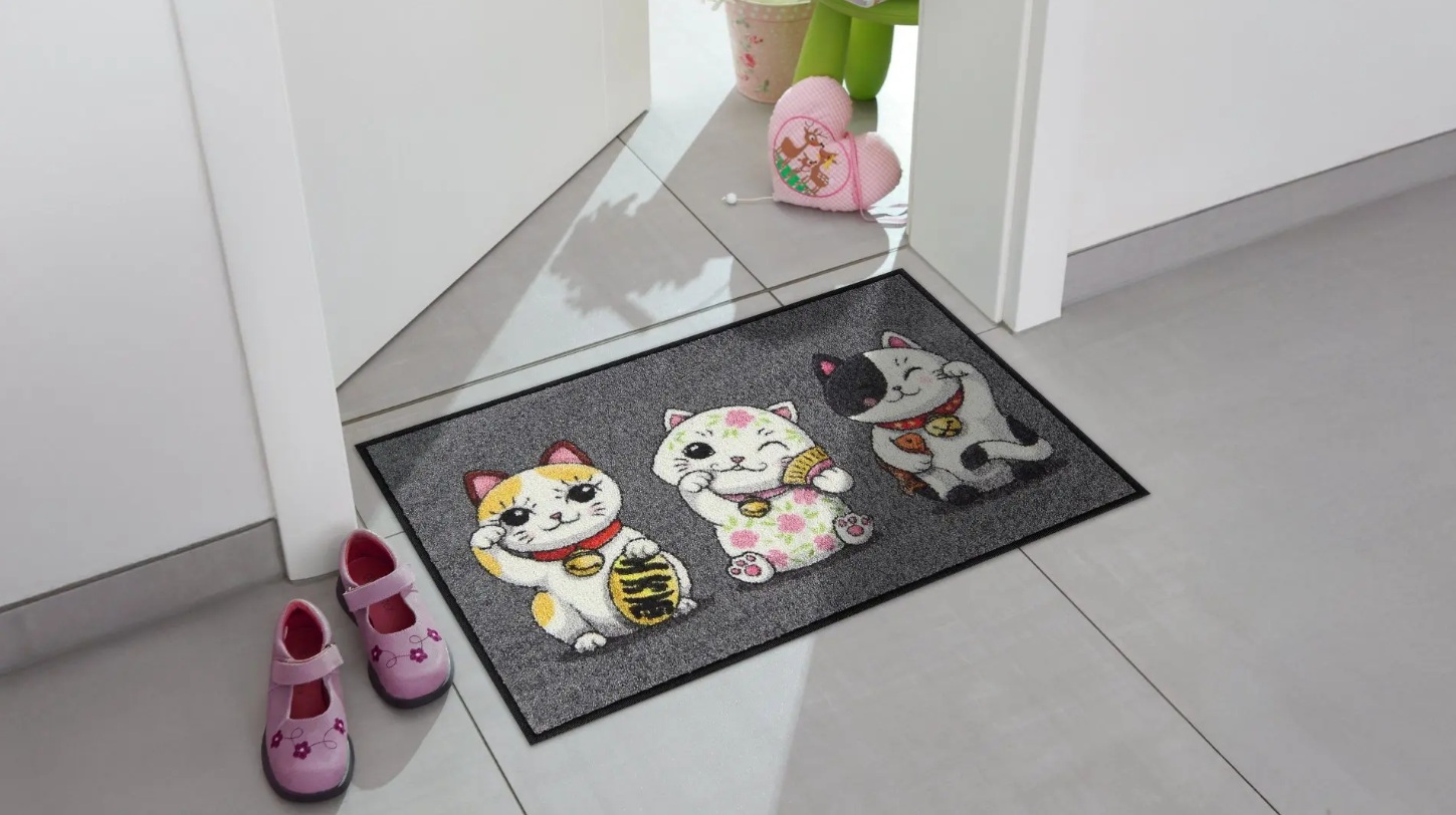 Die Fussmatte “Lucky Cats grey” die in jede Wohnung und jede Waschmaschine passt. Alle Salonloewe Fussmatten sind