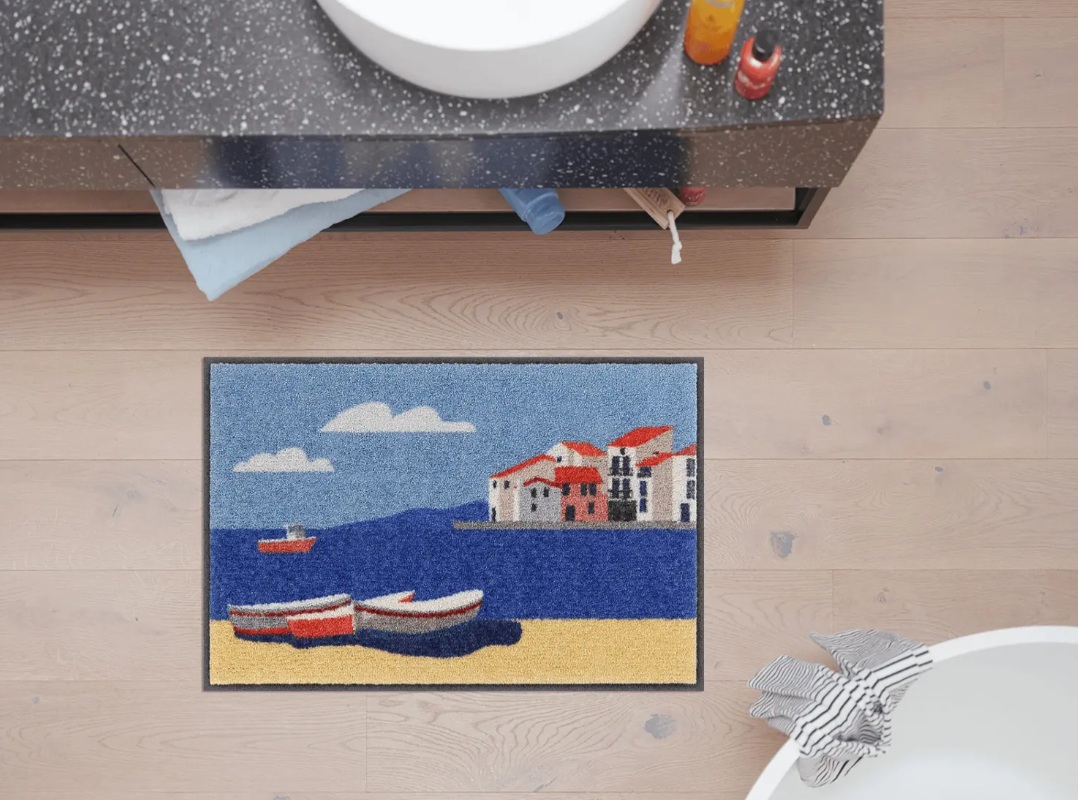 Die Fussmatte “Seaside Paradise” die in jede Wohnung und jede Waschmaschine passt. Alle Salonloewe Fussmatten sind