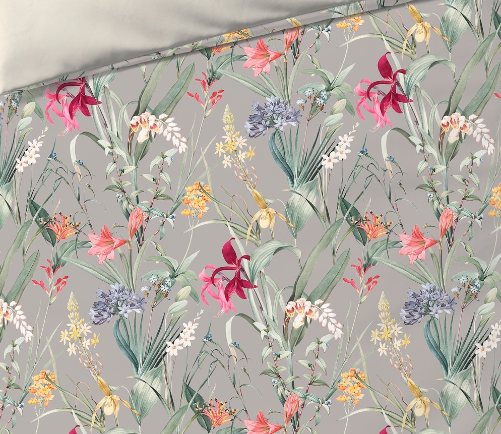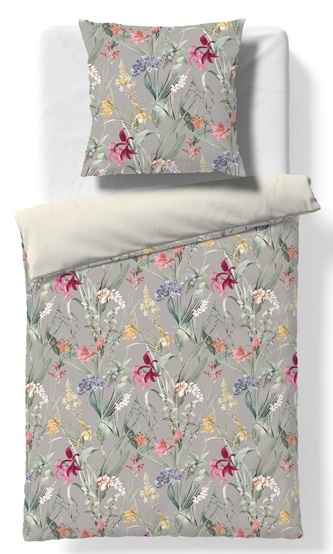 Diese stilvolle Jersey-Bettwäsche präsentiert ein zartes florales Design auf einem klaren grauen Hintergrund. Feine