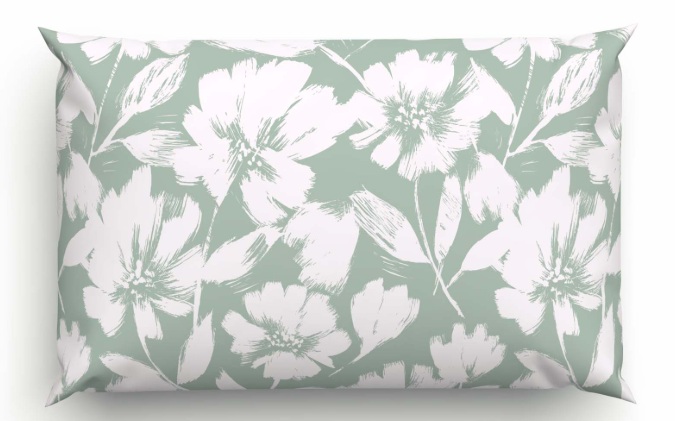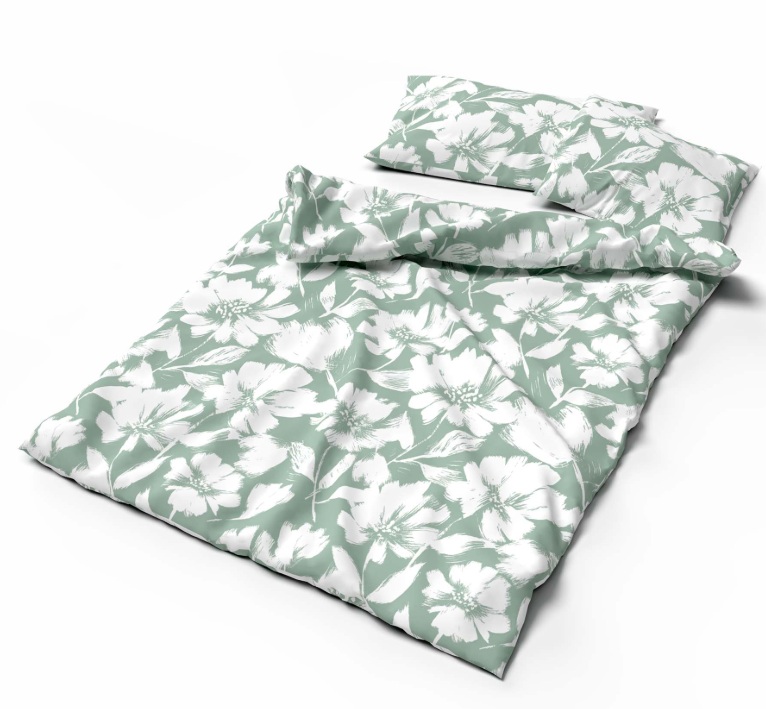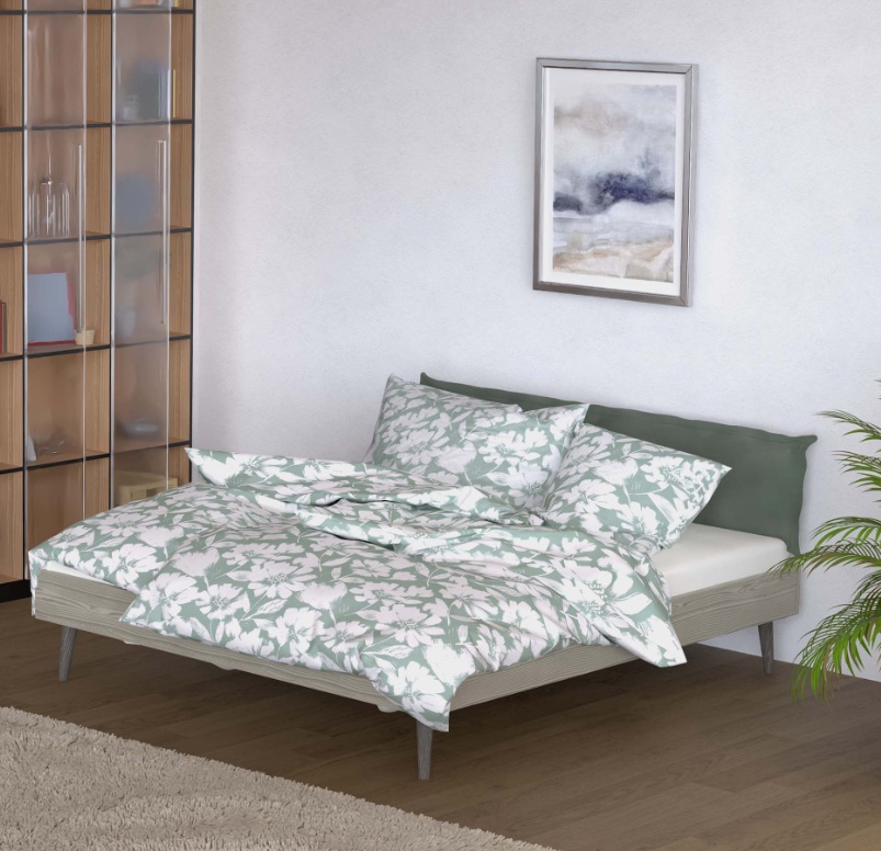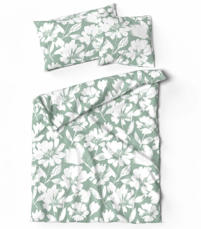 Die Lotus Bettwäsche Luisa verzaubert mit ihrem wunderschönen Blumenmuster in zartem Weiß und dezentem Salbeigrün.