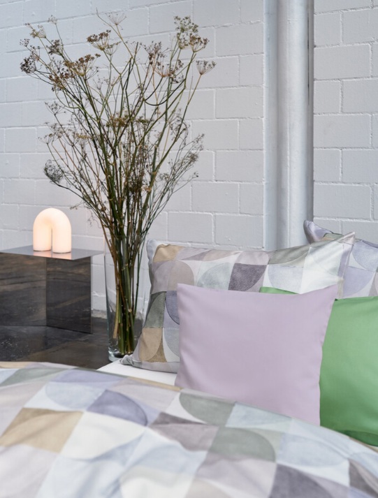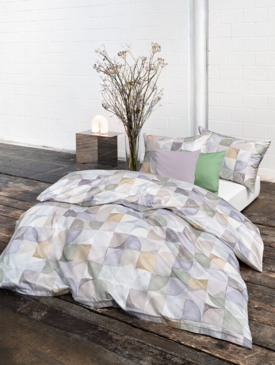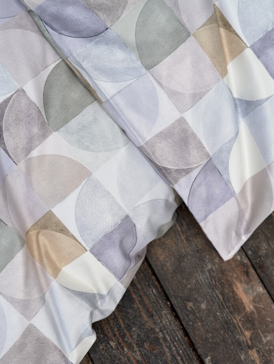 Sanfte Viertel- und Halbkreise formen ein grafisches Muster in dezenten Pastellfarben und verleihen dem Dessin eine moderne,