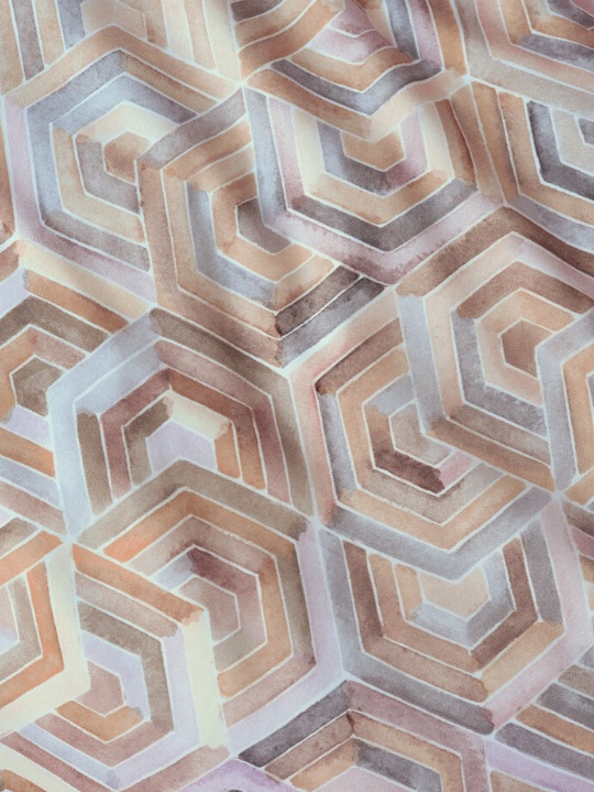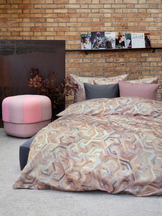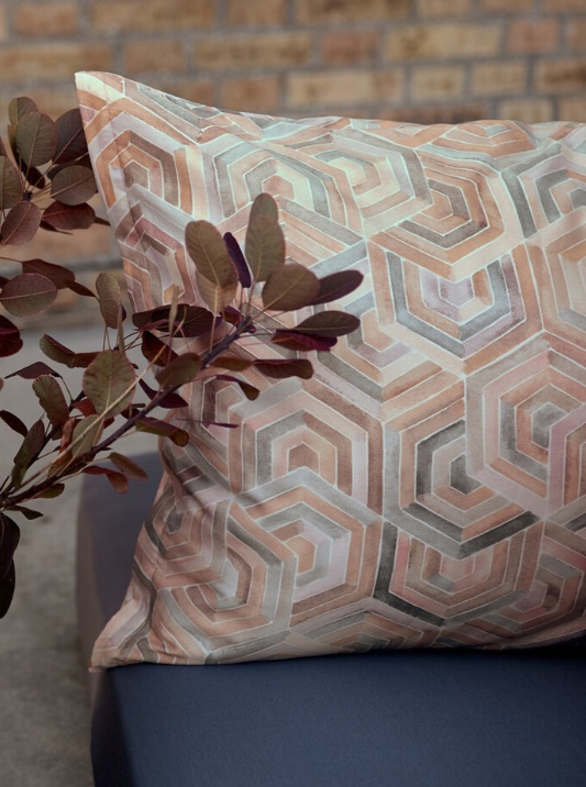 Sanft ineinander übergehende Sechsecke in Rosétönen, Braun und Anthrazit verleihen dem Dessin eine moderne, zugleich