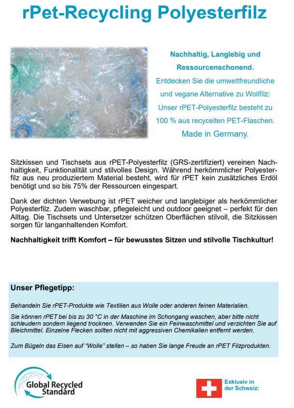 Sitzkissen und Tischsets aus rPET-Polyesterfilz ( GRS-zertifiziert ) vereinen Nachhaltigkeit, Funktionalität und